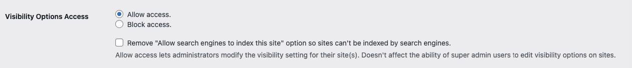 Selecting ‘Remove “Allow search engines to index this site’ when “Allow access” is selected removes “Allow search engines from indexing this site” in the visibility option list on Settings > Reading.   You would use this option if you wanted to prevent admin users from changing their sites to “Allow search engines to index this site.”